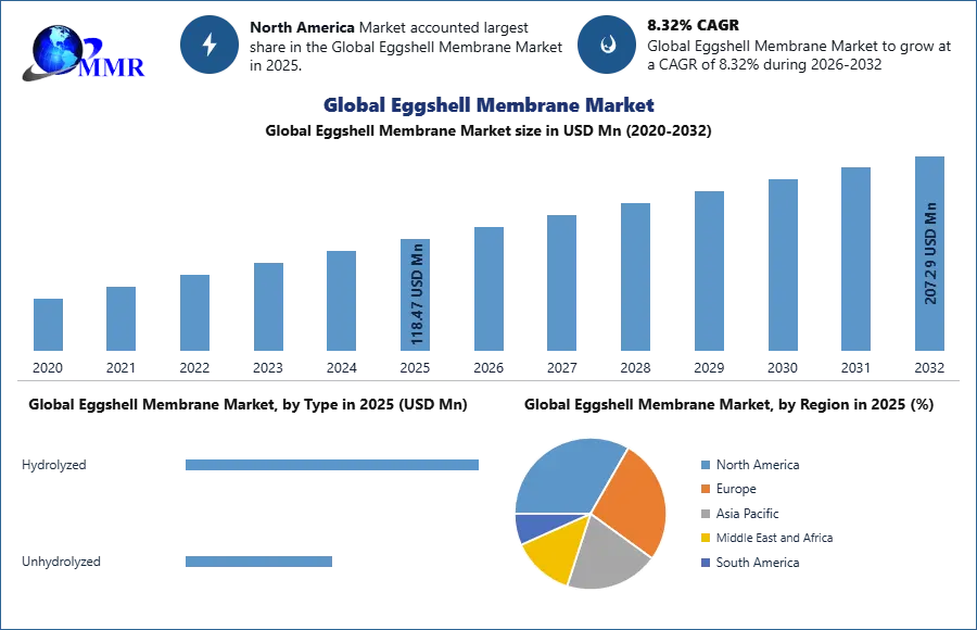 The Eggshell Membrane Market anticipated to grow at a CAGR of 8.32% throughout the period of assessment to reflect a market value of US$ 207.29Bn by 2032 from a value of US$ 118.47 Bn in 2025.